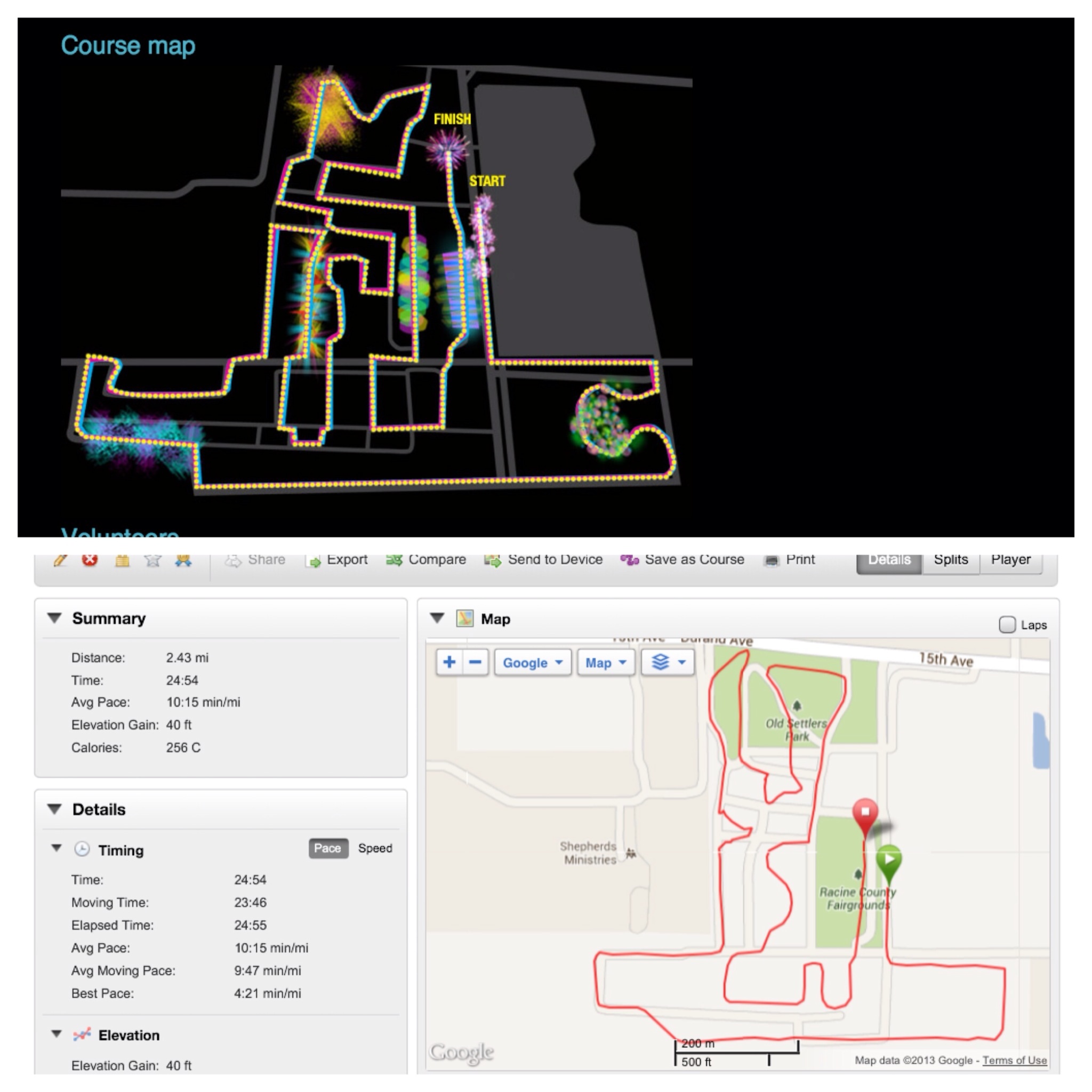 Course map and what my Garmin mapped. Should have been a 5K, but we were 0.67 miles short!