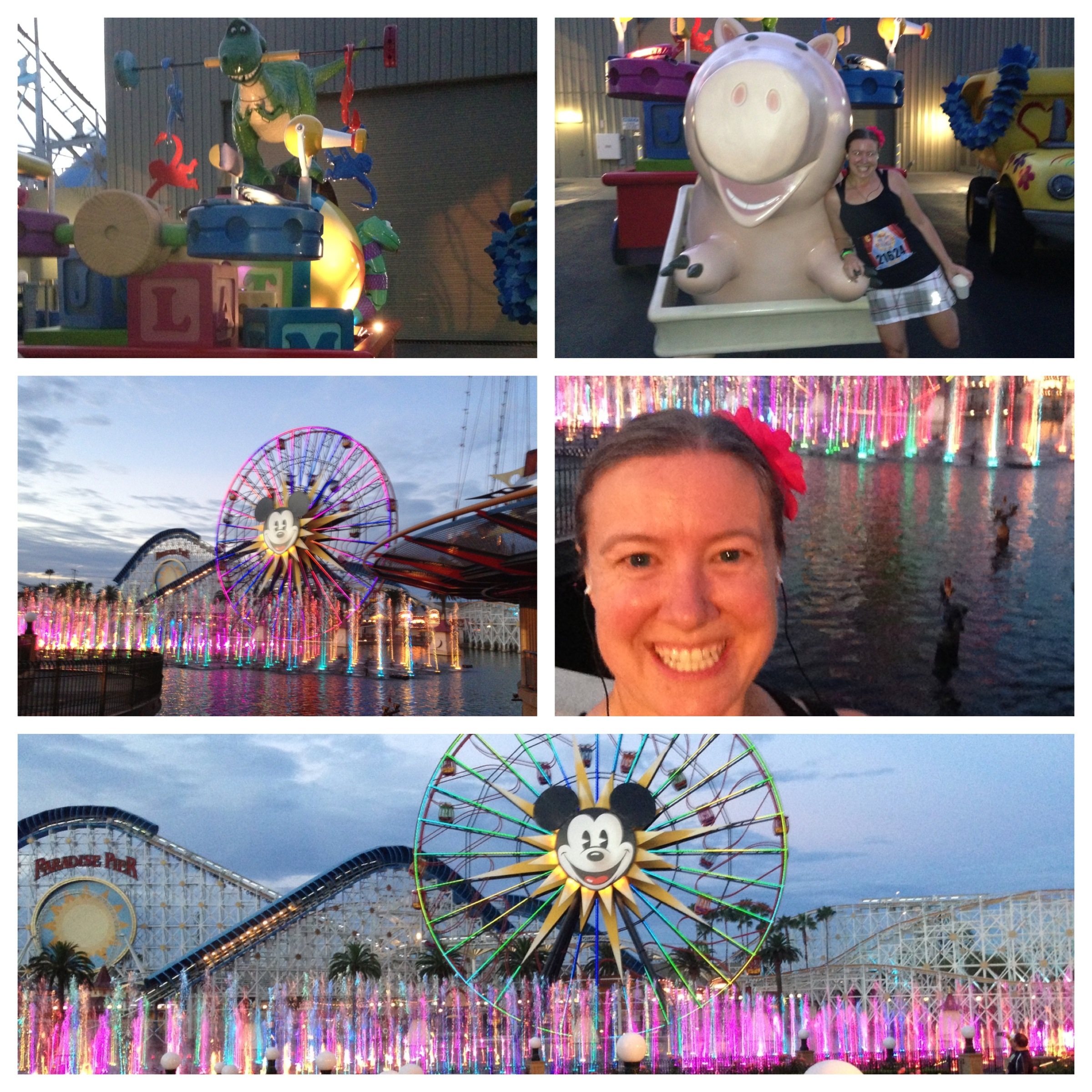 The race started on time, took about 12-15min from the start before my corral started and then we were off, I love the race atmosphere and this race didn’t disappoint, there were lots and lots of people cheering us on at the start and for the first few miles, just after mile 1 we were headed into the parks, we ran backstage for a bit and just before mile 2 we were in Disney California Adventures, it was still dark out and everything was lit up, it was so so pretty. We ran past the water and the Ferris wheel which were both lit so pretty, then into my favorite area, Cars Land. I stopped for a few pictures and loved all the neon and how it looked at night.